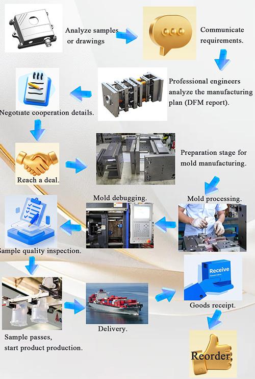 Rysunki kontrolne - analiza przepływu formy - walidacja projektu - Materiały niestandardowe - obróbka formy - obróbka rdzenia - obróbka elektrod - obróbka systemu wlewów - obróbka i zakup części - akceptacja obróbki - proces obróbki powierzchni wnęki - tryb złożony Matryca - cała powłoka powierzchni formy - Płyta montażowa - próbka formy - test próbki - wysyłanie próbek |